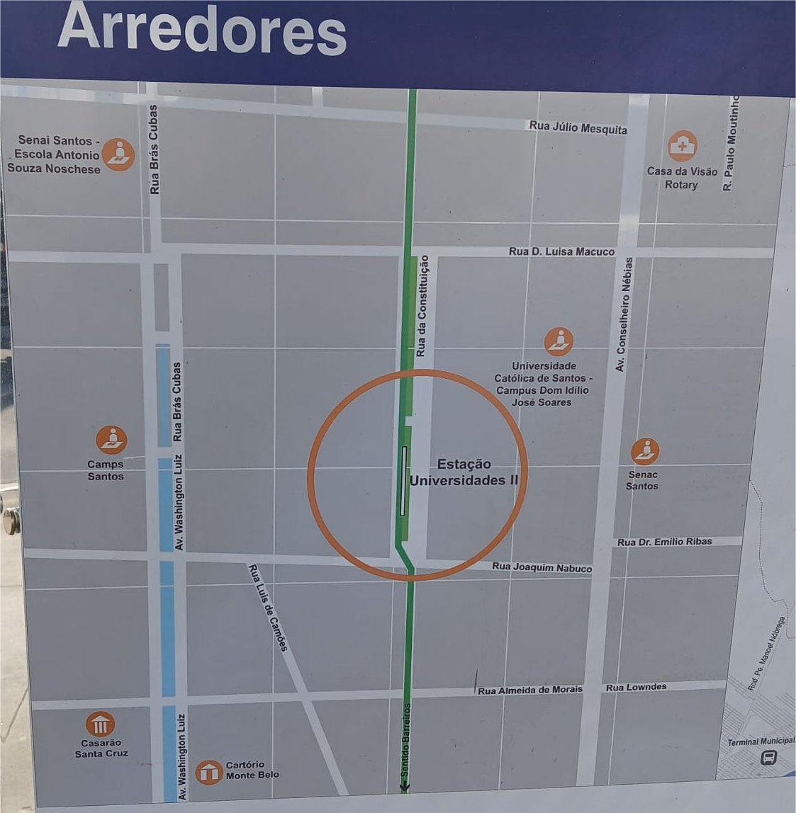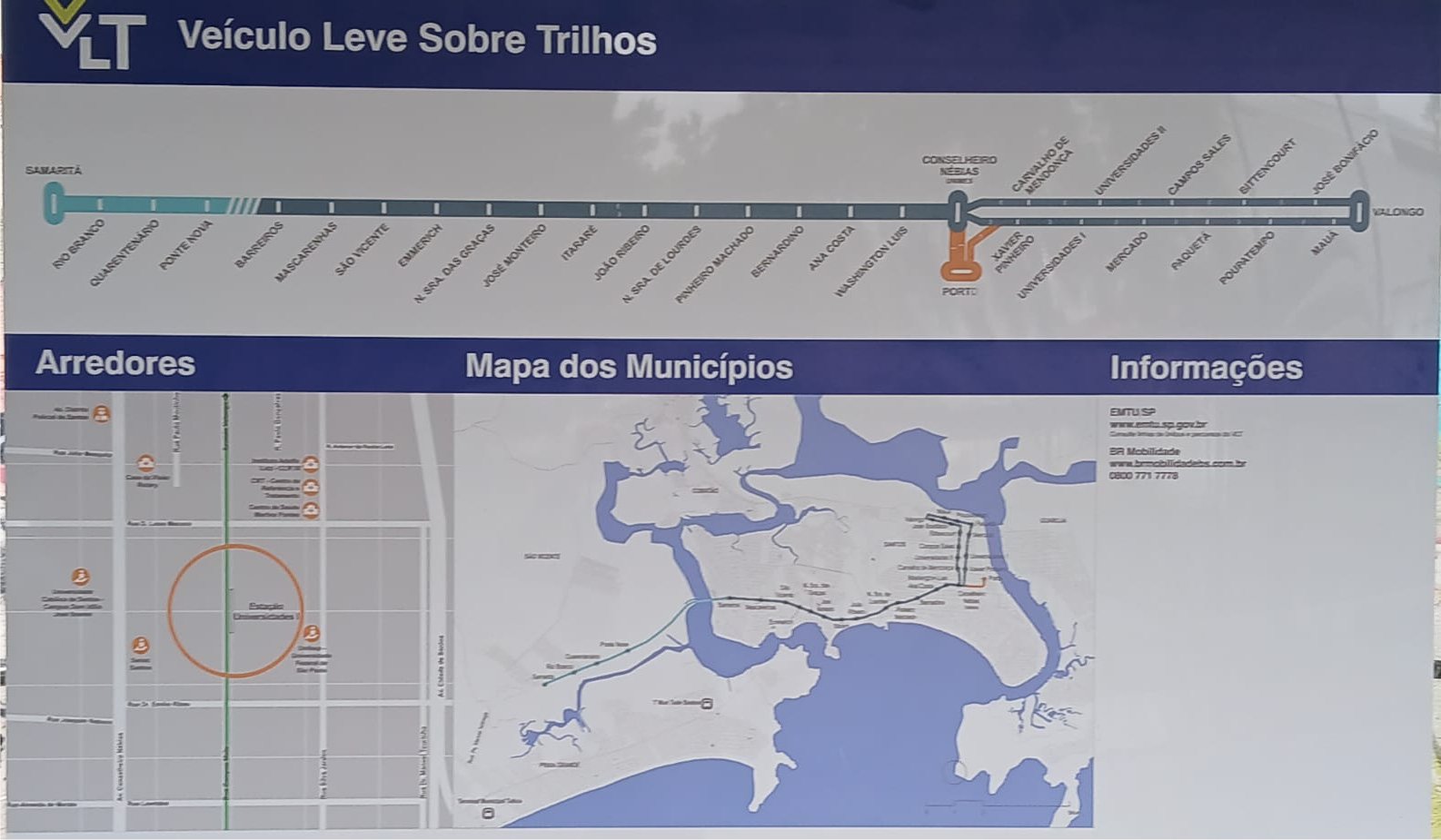 A Estação VLT Universidades 2 - UNISANTOS fica na Rua da Constituição, próxima da UNISANTOS