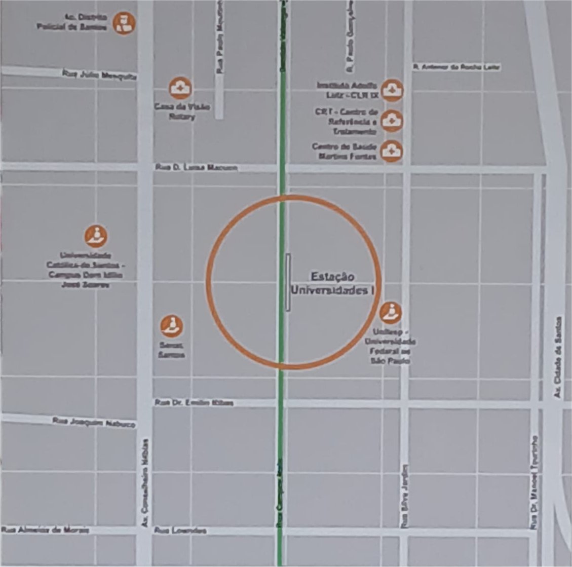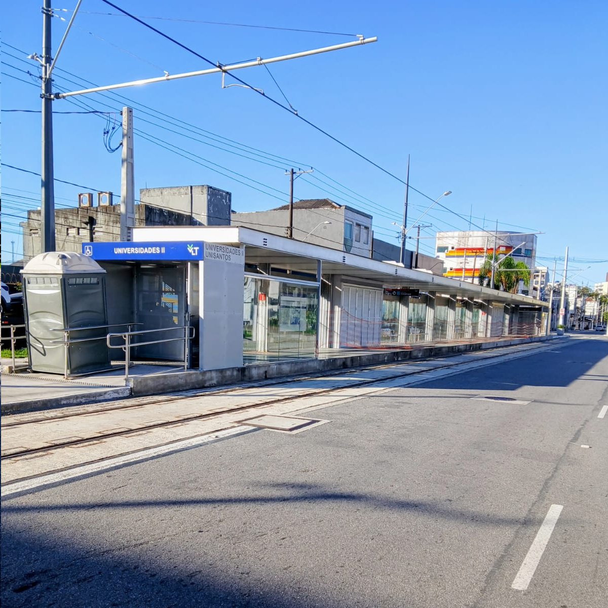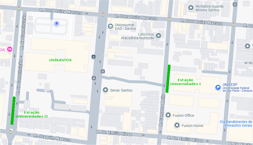 A Estação VLT Universidades 2 - UNISANTOS fica na Rua da Constituição, próxima da UNISANTOS