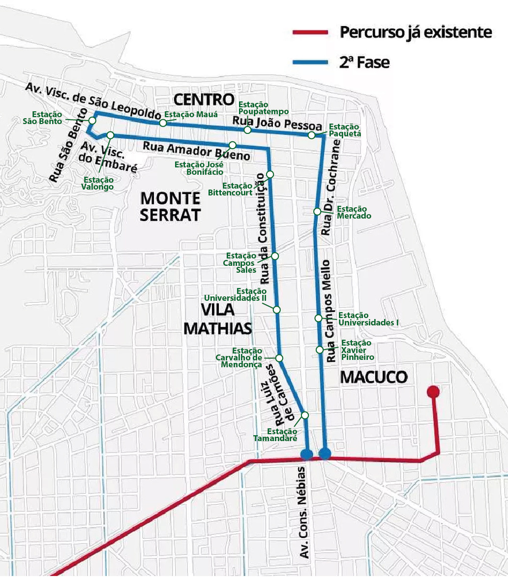 A segunda fase do VLT vai integrar linhas de ônibus e o próprio modal já em operação na Avenida Francisco Glicério, em Santos, integrando as estações Conselheiro Nébias e Valongo.